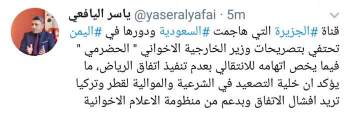 وكتب اليافعي، في تغريدة له على موقع التواصل الاجتماعي تويتر، تابعها المشهد العربي: "قناة الجزيرة التي هاجمت السعودية ودورها في اليمن تحتفي بتصريحات وزير الخارجية الإخواني الحضرمي، فيما يخص اتهامه للانتقالي بعدم تنفيذ اتفاق الرياض".