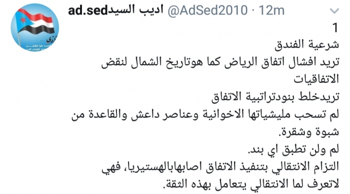 وكتب السيد، في تغريدة له على موقع التواصل الاجتماعي تويتر، تابعها المشهد العربي: "شرعية الفندق تريد إفشال اتفاق الرياض كما هو تاريخ الشمال لنقض الاتفاقيات".
