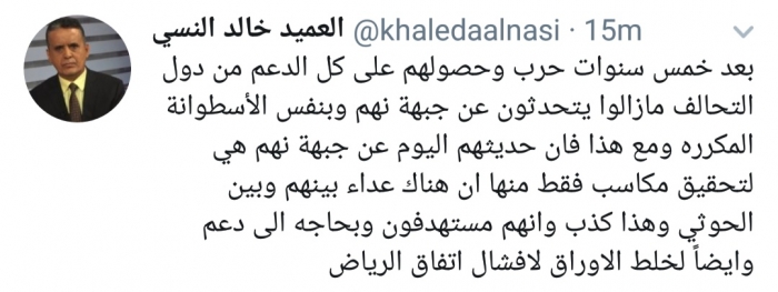 وكتب النسي، في تغريدة له على موقع التواصل الاجتماعي تويتر، تابعها المشهد العربي: "بعد خمس سنوات حرب وحصولهم على كل الدعم من دول التحالف مازالوا يتحدثون عن جبهة نهم وبنفس الأسطوانة المكررة".