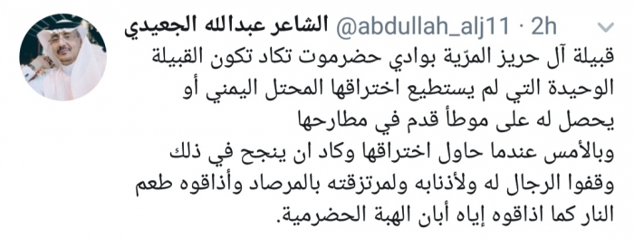 وكتب الجعيدي، في تغريدة له على موقع التواصل الاجتماعي تويتر، تابعها المشهد العربي: "قبيلة آل حريز المرّية بوادي حضرموت تكاد تكون القبيلة الوحيدة التي لم يستطع اختراقها المحتل اليمني أو يحصل له على موطأ قدم في مطارحها".