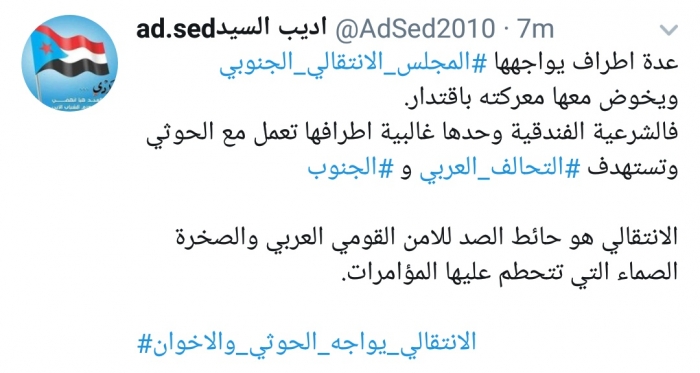 وكتب السيد، في تغريدة له على موقع التواصل الاجتماعي تويتر، تابعها المشهد العربي: "عدة أطراف يواجهها المجلس الانتقالي الجنوبي ويخوض معها معركته باقتدار".
