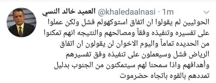 وكتب النسي، في تغريدة له على موقع التواصل الاجتماعي تويتر، تابعها المشهد العربي: "الحوثيون لم يقولوا إن اتفاق استوكهولم فشل ولكن عملوا على تفسيره وتنفيذه وفقاً لمصالحهم والنتيجة أنهم تمكنوا من الحديدة تماماً".