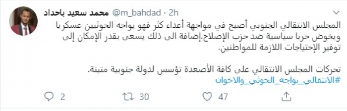 وكتب في تغريدة عبر "تويتر" رصدها "المشهد العربي": "المجلس الانتقالي الجنوبي أصبح في مواجهة أعداء كثر فهو يواجه الحوثيين عسكريًا ويخوض حربًا سياسية ضد حزب الإصلاح، إضافة الى ذلك يسعى بقدر الإمكان إلى توفير الاحتياجات اللازمة للمواطنين. تحركات المجلس الانتقالي على كافة الأصعدة تؤسس لدولة جنوبية متينة".