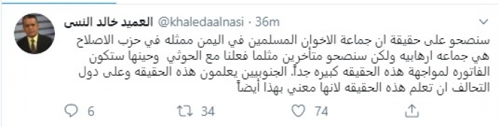 وقال في تغريدة عبر "تويتر" رصدها "المشهد العربي": "سنصحو على حقيقة أن جماعة الإخوان المسلمين في اليمن ممثلة في حزب الإصلاح هي جماعة إرهابية ولكن سنصحو متأخرين مثلما فعلنا مع الحوثي وحينها ستكون الفاتورة لمواجهة هذه الحقيقة كبيرة جداً. الجنوبيين يعلمون هذه الحقيقة وعلى دول التحالف أن تعلم هذه الحقيقة لأنه معني بهذا أيضاً".