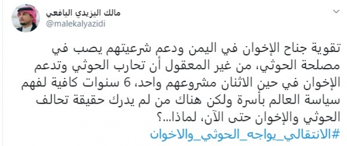 وقال في تغريدة عبر "تويتر" رصدها "المشهد العربي": "تقوية جناح الإخوان في اليمن ودعم شرعيتهم يصب في مصلحة الحوثي، من غير المعقول أن تحارب الحوثي وتدعم الإخوان في حين الاثنان مشروعهم واحد، 6 سنوات كافية لفهم سياسة العالم بأسره ولكن هناك من لم يدرك حقيقة تحالف الحوثي والإخوان حتى الآن، لماذا؟".