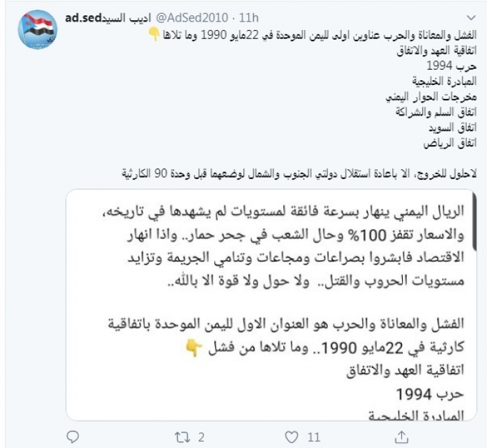 وقال في تغريدة عبر "تويتر" رصدها "المشهد العربي": "الفشل والمعاناة والحرب عناوين أولى لليمن الموحدة في 22مايو 1990 وما تلاها اتفاقية العهد والاتفاق. حرب 1994. المبادرة الخليجية. مخرجات الحوار اليمني. اتفاق السلم والشراكة. اتفاق السويد. اتفاق الرياض. لا حلول للخروج، إلا باعادة استقلال دولتي الجنوب والشمال لوضعهما قبل وحدة 90 الكارثية".