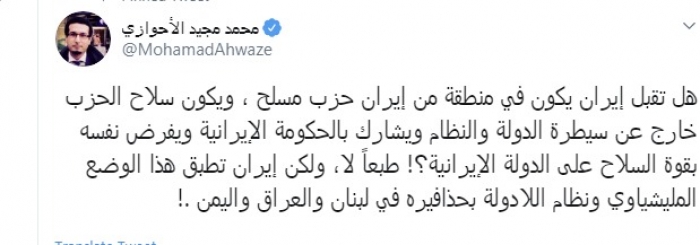 وجه الكاتب الصحفي محمد مجيد الأحوازي، اليوم، تساؤلًا مُحرجًا لدولة إيران بشأن مليشياتها في المنطقة العربية.