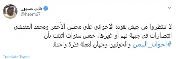 وكتب في تغريدة عبر "تويتر" رصدها "المشهد العربي": "لا تنتظروا من جيش يقوده الإخواني علي محسن الأحمر ومحمد المقدشي انتصارات في جبهة نهم أو غيرها، خمس سنوات أثبتت بأن إخوان اليمن والحوثيين وجهان لعملة .... واحدة".