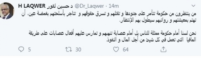 شن المحلل السياسي الدكتور حسين لقور، اليوم، هجومًا حادًا على حكومة الشرعية، واصفاً إياها بالعصابة.