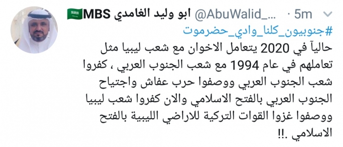 وكتب الغامدي، في تغريدة له عبر موقع التواصل الاجتماعي تويتر، تابعها المشهد العربي: "حاليا في 2020 يتعامل الإخوان مع شعب ليبيا مثل تعاملهم في عام 1994 مع شعب الجنوب العربي".