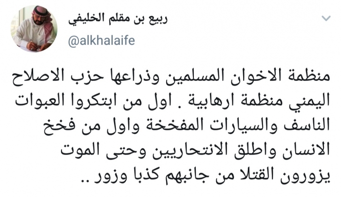 وكتب الخليفي، في تغريدة له عبر موقع التواصل الاجتماعي تويتر، تابعها المشهد العربي: "منظمة الإخوان المسلمين وذراعها حزب الإصلاح اليمني منظمة إرهابية".