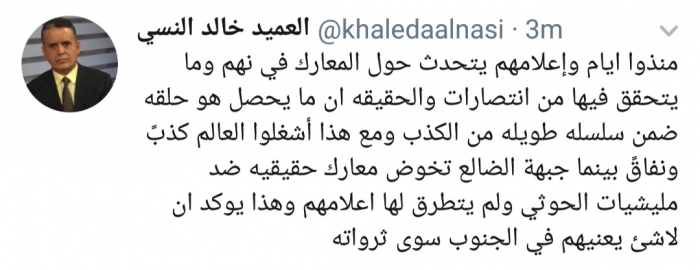 وكتب النسي، في تغريدة له عبر موقع التواصل الاجتماعي تويتر، تابعها المشهد العربي: "منذ أيام وإعلامهم يتحدث حول المعارك في نهم وما يتحقق فيها من انتصارات والحقيقة أن ما يحصل هو حلقه ضمن سلسلة طويلة من الكذب ومع هذا أشغلوا العالم كذبًا ونفاقًا".