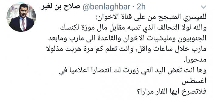 وكتب بن لغبر، في تغريدة له عبر موقع التواصل الاجتماعي تويتر، تابعها المشهد العربي: "للميسري المتبجح من على قناة الإخوان: والله لولا التحالف الذي تسبه مقابل مال موزة لكنسك الجنوبيون ومليشيات الإخوان والقاعدة إلى مأرب وما بعد مأرب خلال ساعات وأقل، وأنت تعلم كم مرة هربت مذلولا مدحورا".