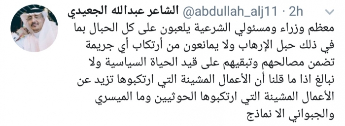 وكتب الجعيدي، في تغريدة له عبر موقع التواصل الاجتماعي تويتر، تابعها المشهد العربي: "معظم وزراء ومسئولي الشرعية يلعبون على كل الحبال بما في ذلك حبل الإرهاب ولا يمانعون من ارتكاب أي جريمة تضمن مصالحهم وتبقيهم على قيد الحياة السياسية".