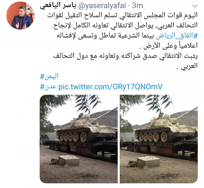 وكتب اليافعي، في تغريدة له عبر موقع التواصل الاجتماعي تويتر، تابعها المشهد العربي: "اليوم قوات المجلس الانتقالي تسلم السلاح الثقيل لقوات التحالف العربي".