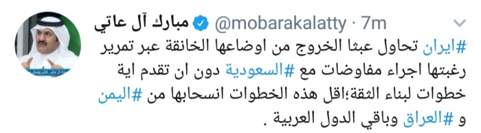 وكتب آل عاتي، في تغريدة له عبر موقع التواصل الاجتماعي تويتر، تابعها المشهد العربي: "إيران تحاول عبثا الخروج من أوضاعها الخانقة عبر تمرير رغبتها إجراء مفاوضات مع السعودية دون أن تقدم أي خطوات لبناء الثقة".