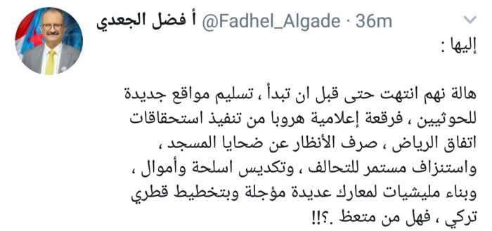 اعتبر عضو هيئة رئاسة المجلس الانتقالي الجنوبي فضل الجعدي، أن تسليم مواقع جديدة للحوثيين بمثابة "فرقعة إعلامية" هروبا من تنفيذ بنود اتفاق الرياض.
