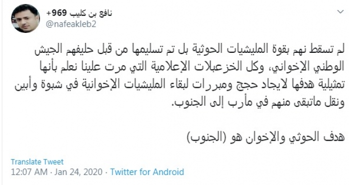 وقال في تغريدة على حسابه بموقع التواصل الاجتماعي، تويتر، إنه: "لم تسقط نهم بقوة المليشيات الحوثية بل تم تسليمها من قبل حليفهم الجيش الوطني الإخواني".