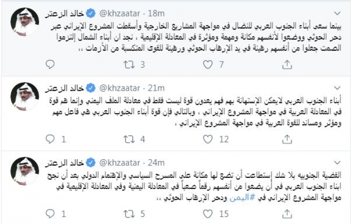 وأضاف: "أبناء الجنوب العربي لا يمكن الاستهانة بهم فهم يعدون قوة ليست فقط في معادلة الملف اليمني وإنما هم قوة في المعادلة العربية في مواجهة المشروع الإيراني، وبالتالي فإن قوة أبناء الجنوب العربي هي فاعل مهم ومؤثر ومساند للقوة العربية في مواجهة المشروع الإيراني".