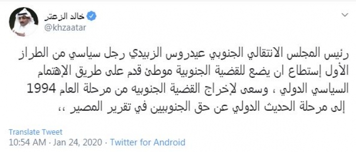 وقال في تغريدة عبر "تويتر" رصدها "المشهد العربي": "رئيس المجلس الانتقالي الجنوبي عيدروس الزُبيدي رجل سياسي من الطراز الأول استطاع أن يضع للقضية الجنوبية موطئ قدم على طريق الاهتمام السياسي الدولي، وسعى لإخراج القضية الجنوبية من مرحلة العام 1994 إلى مرحلة الحديث الدولي عن حق الجنوبيين في تقرير المصير".