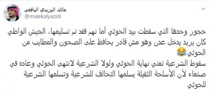 أكد الناشط السياسي مالك اليزيدي اليافعي، اليوم، أن سقوط حكومة الشرعية اليمنية يعني نهاية مليشيات الحوثي.