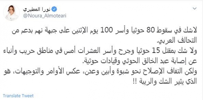 وقالت في تغريدة عبر "تويتر" رصدها "المشهد العربي": "لا شك في سقوط 80 حوثيا وأسر 100 يوم الاثنين على جبهة نهم بدعم من التحالف العربي. ولا شك بمقتل 15 حوثيا وجرح وأسر العشرات أمس في مناطق حريب وأنباء عن إصابة عبد الخالق الحوثي وقيادات حوثية. ولكن التفاف الإصلاح نحو شبوة وأبين وعدن، عكس الأوامر والتوجيهات، هو الذي يثير الشك والريبة".