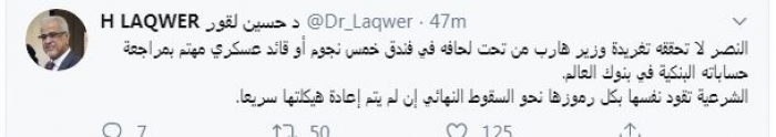 وقال في تغريدة عبر "تويتر" رصدها "المشهد العربي": "النصر لا تحققه تغريدة وزير هارب من تحت لحافه في فندق خمس نجوم أو قائد عسكري مهتم بمراجعة حساباته البنكية في بنوك العالم. الشرعية تقود نفسها بكل رموزها نحو السقوط النهائي إن لم يتم إعادة هيكلتها سريعًا".