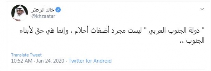 وقال في تغريدة عبر "تويتر" رصدها "المشهد العربي": "دولة الجنوب العربي ليست مجرد أضغاث أحلام، وإنما هي حق لأبناء الجنوب".