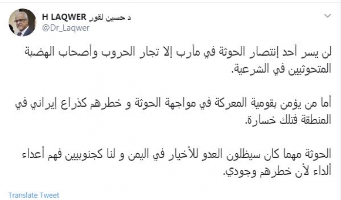 وقال في تغريدة عبر "تويتر" رصدها "المشهد العربي": "لن يسر أحد انتصار الحوثة في مأرب إلا تجار الحروب وأصحاب الهضبة المتحوثيين في الشرعية. أما من يؤمن بقومية المعركة في مواجهة الحوثة وخطرهم كذراع إيراني في المنطقة فتلك خسارة. الحوثة مهما كان سيظلون العدو للأخيار في اليمن ولنا كجنوبيين فهم أعداء ألداء لأن خطرهم وجودي".