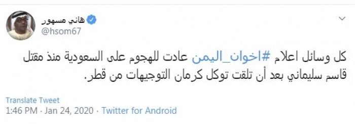 وقال في تغريدة عبر "تويتر" رصدها "المشهد العربي": "كل وسائل اعلام إخوان اليمن عادت للهجوم على السعودية منذ مقتل قاسم سليماني بعد أن تلقت توكل كرمان التوجيهات من قطر".