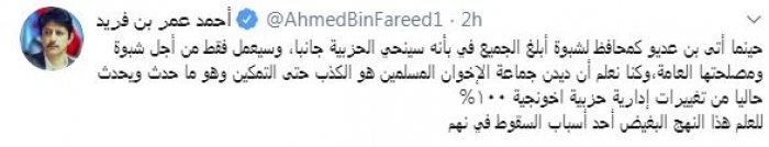 وقال في تغريدة عبر "تويتر" رصدها "المشهد العربي": "حينما أتى بن عديو كمحافظ لشبوة أبلغ الجميع بأنه سينحي الحزبية جانبًا، وسيعمل فقط من أجل شبوة ومصلحتها العامة، وكنا نعلم أن ديدن جماعة الإخوان المسلمين هو الكذب حتى التمكين وهو ما حدث ويحدث حاليا من تغييرات إدارية حزبية إخونجية ١٠٠% للعلم هذا النهج البغيض أحد أسباب السقوط في نهم".