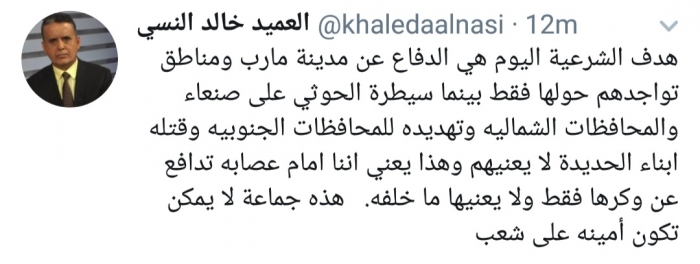 وكتب النسي، في تغريدة له عبر موقع التواصل الاجتماعي تويتر، تابعها المشهد العربي: "هدف الشرعية اليوم هو الدفاع عن مدينة مأرب ومناطق تواجدهم حولها فقط بينما سيطرة الحوثي على صنعاء والمحافظات الشمالية وتهديده للمحافظات الجنوبية وقتله أبناء الحديدة لا يعنيهم".
