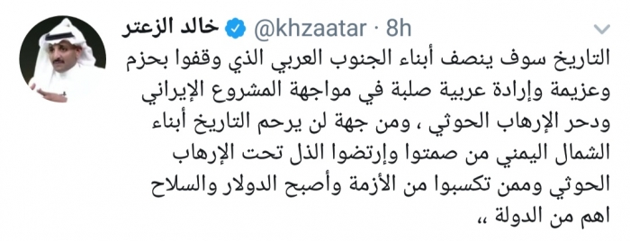 وكتب الزعتر، في تغريدة له عبر موقع التواصل الاجتماعي تويتر، تابعها المشهد العربي: "التاريخ سوف ينصف أبناء الجنوب العربي الذي وقفوا بحزم وعزيمة وإرادة عربية صلبة في مواجهة المشروع الإيراني ودحر الإرهاب الحوثي".