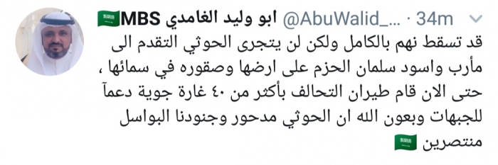وتابع: "حتى الآن قام طيران التحالف بأكثر من ٤٠ غارة جوية دعما للجبهات وبعون الله إن الحوثي مدحور وجنودنا البواسل منتصرين".