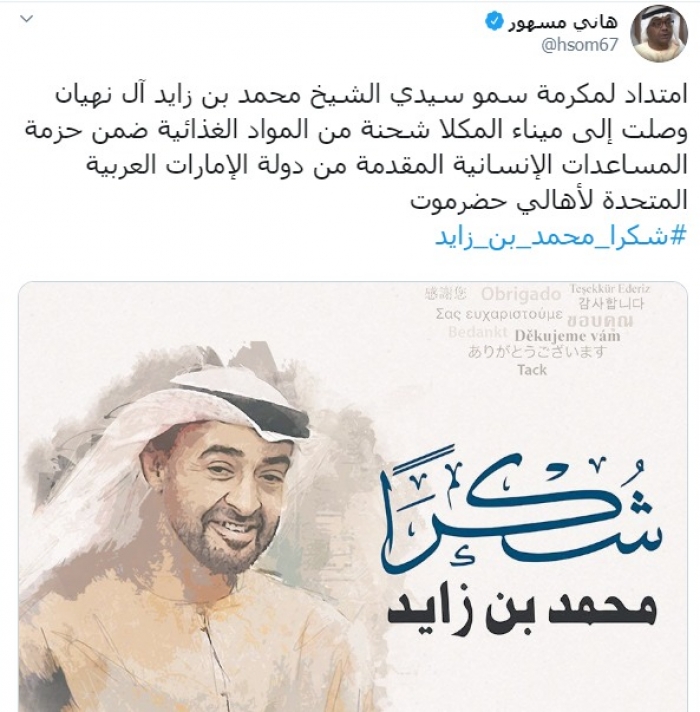 وقال مسهور، في تغريدة نشرها عبر حسابه بـ"تويتر"، رصدها "المشهد العربي": "امتداد لمكرمة سمو سيدي الشيخ محمد بن زايد آل نهيان وصلت إلى ميناء المكلا شحنة من المواد الغذائية ضمن حزمة المساعدات الإنسانية المقدمة من دولة الإمارات العربية المتحدة لأهالي حضرموت".