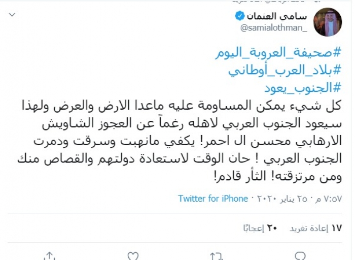 وقال العثمان في تغريدة نشرها عبر حسابه بـ"تويتر"، رصدها المشهد العربي: "كل شيء يمكن المساومة عليه ماعدا الأرض والعرض ولهذا سيعود الجنوب العربي لأهله رغماً عن العجوز الشاويش الإرهابي محسن الأحمر".