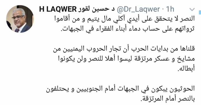 وتابع: "قلناها من بدايات الحرب أن تجار الحروب اليمنيين من مشايخ وعسكر مرتزقة ليسوا أهلا للنصر ولن يكونوا أبطاله".