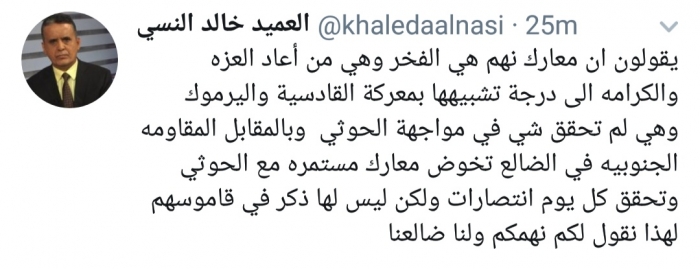وكتب النسي، في تغريدة له عبر موقع التواصل الاجتماعي تويتر، تابعها المشهد العربي: "يقولون إن معارك نهم هي الفخر وهي من أعاد العزة والكرامة إلى درجة تشبيهها بمعركة القادسية واليرموك وهي لم تحقق شيء في مواجهة الحوثي".