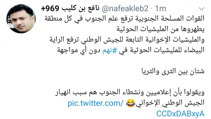 وكتب بن كليب، في تغريدة له عبر موقع التواصل الاجتماعي تويتر، تابعها المشهد العربي: "القوات المسلحة الجنوبية ترفع علم الجنوب في كل منطقة يطهروها من المليشيات الحوثية، والمليشيات الإخوانية التابعة للجيش الوطني ترفع الراية البيضاء للمليشيات الحوثية في نهم دون أي مواجهة".
