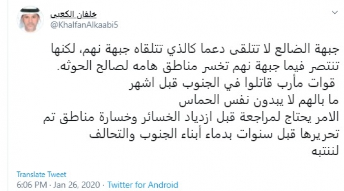 وقال في تغريدة عبر "تويتر" رصدها "المشهد العربي": "جبهة الضالع لا تتلقى دعماً كالذي تتلقاه جبهة نهم، لكنها تنتصر فيما جبهة نهم تخسر مناطق هامة لصالح الحوثة. قوات مأرب قاتلوا في الجنوب قبل أشهر ما بالهم لا يبدون نفس الحماس الأمر يحتاج لمراجعة قبل ازدياد الخسائر وخسارة مناطق تم تحريرها قبل سنوات بدماء أبناء الجنوب والتحالف لننتبه".
