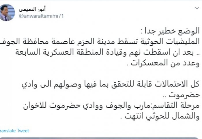 وقال في تغريدة عبر "تويتر" رصدها "المشهد العربي": "الوضع خطير جدًا.. المليشيات الحوثية تسقط مدينة الحزم عاصمة محافظة الجوف.. بعد أن أسقطت نهم وقيادة المنطقة العسكرية السابعة وعدد من المعسكرات. كل الاحتمالات قابلة للتحقق بما فيها وصولهم الى وادي حضرموت.. مرحلة التقاسم: مأرب والجوف ووادي حضرموت للإخوان والشمال للحوثي انتهت".