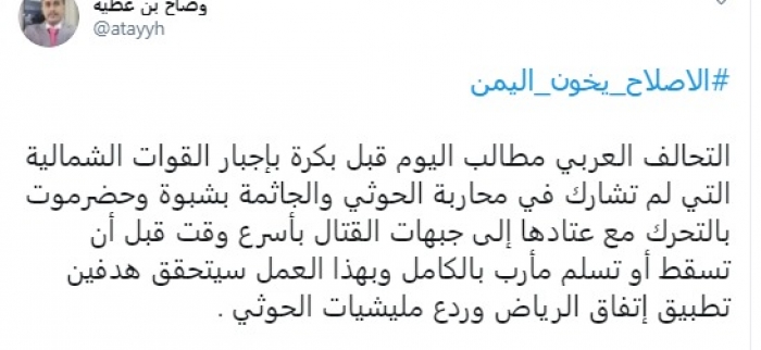 طالب الكاتب الصحفي وضاح بن عطية، اليوم، التحالف العربي بإجبار القوات الشمالية بالتحرك من شبوة وحضرموت إلى جبهات القتال قبل إسقاط مأرب بالكامل.