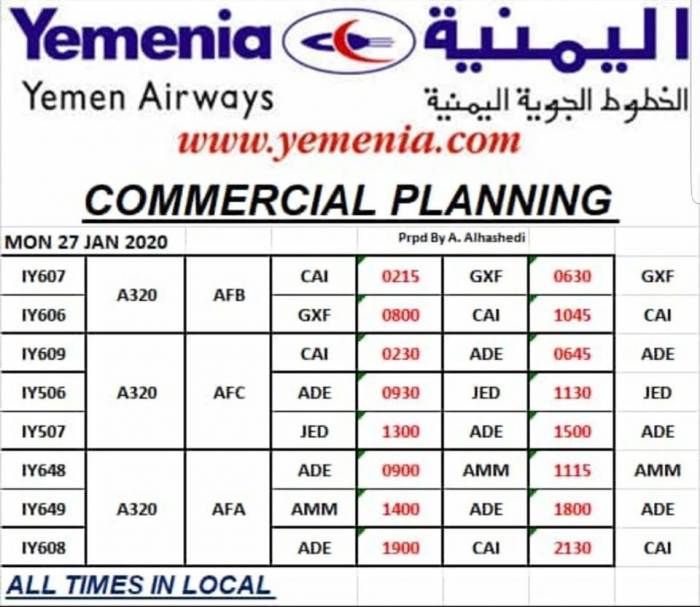 ينشر المشهد العربي جدول رحلات طيران اليمنية، غدا الإثنين، الموافق 27 يناير 2020.
