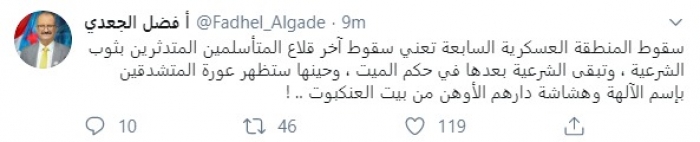 وكتب في تغريدة عبر "تويتر" رصدها "المشهد العربي": "سقوط المنطقة العسكرية السابعة تعني سقوط آخر قلاع المتأسلمين المتدثرين بثوب الشرعية ، وتبقى الشرعية بعدها في حكم الميت، وحينها ستظهر عورة المتشدقين بإسم الآلهة وهشاشة دارهم الأوهن من بيت العنكبوت".