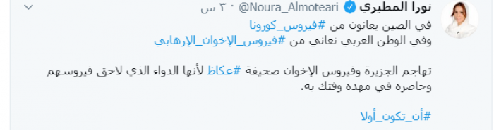وكتبت المطيري عبر تغريدة لها على "تويتر":"في الصين يعانون من فيروس كورونا. وفي الوطن العربي نعاني من فيروس الإخوان الإرهابي".