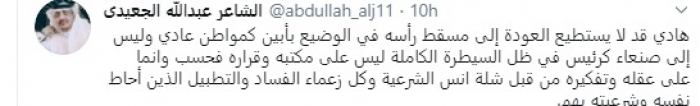 أكد الشاعر عبدالله الجعيدي، اليوم، أن الرئيس اليمني المؤقت عبدربه منصور هادي لا يستطيع العودة لمسقط رأسه بمحافظة أبين كمواطن عادي، وليس لصنعاء كرئيس، وذلك جراء السيطرة على عقله وتفكيره من قبل زعماء الفساد.
