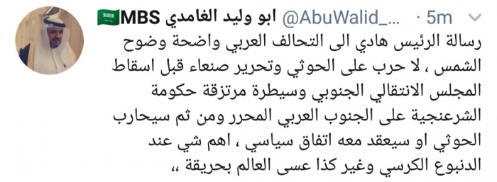 وكتب الغامدي، في تغريدة له على موقع التواصل الاجتماعي تويتر، تابعها المشهد العربي: "رسالة الرئيس هادي إلى التحالف العربي واضحة وضوح الشمس".