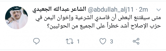 وتساءل الجعيدي، في تغريدة له على موقع التواصل الاجتماعي تويتر، تابعها المشهد العربي: "متى سيقتنع البعض أن فاسدي الشرعية وإخوان اليمن في حزب الإصلاح أشد خطراً على الجميع من الحوثيين؟".