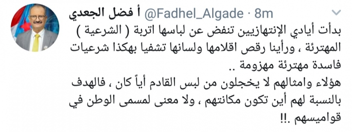 وكتب الجعدي، في تغريدة له على موقع التواصل الاجتماعي تويتر، تابعها المشهد العربي: "بدأت أيادي الإنتهازيين تنفض عن لباسها أتربة الشرعية المهترئة، ورأينا رقص أقلامها ولسانها تشفيا بهكذا شرعيات فاسدة مهترئة مهزومة".