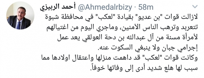 وكتب الربيزي، في تغريدة له على موقع التواصل الاجتماعي تويتر، تابعها المشهد العربي: "لازالت قوات بن عديو بقيادة لعكب في محافظة شبوة تتعربد وترهب الناس الآمنين، وما جرى اليوم من اغتيالهم لإمرأة مسنة من آل عبدالله بن دحة العولقي يعد عمل إجرامي جبان ولا ينبغي السكوت عنه".